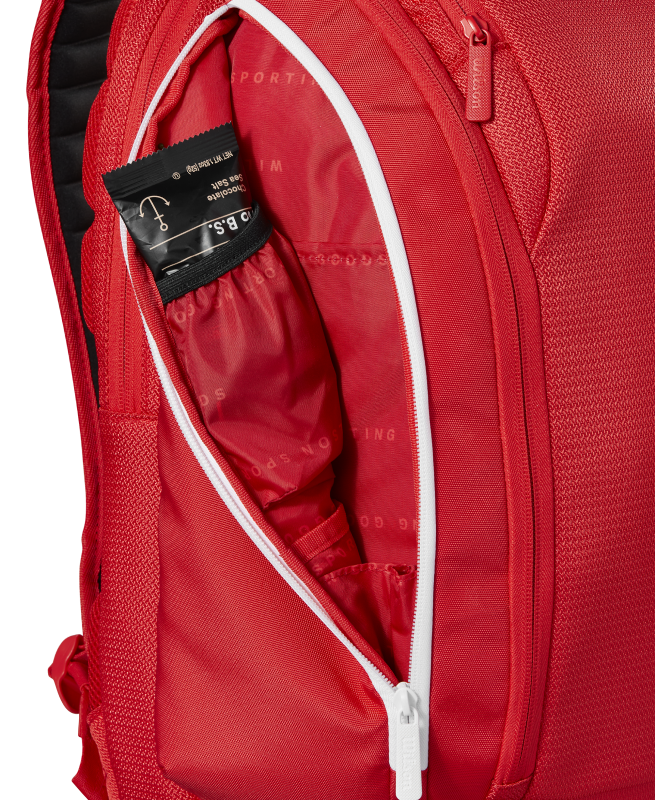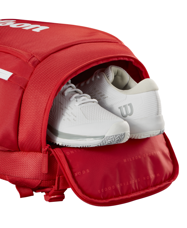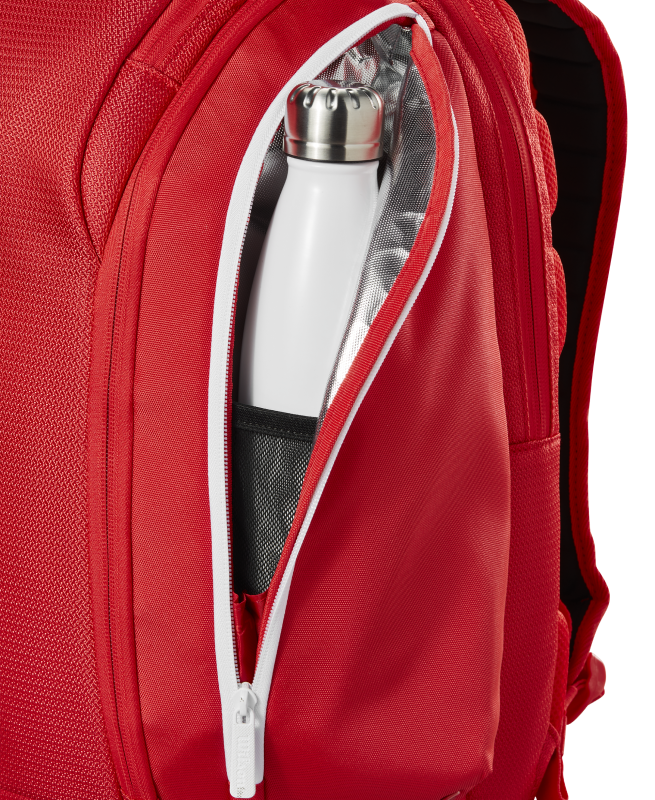 Outras características incluem um bolso ventilado para sapatos ou roupas sujas, um bolso lateral forrado com Thermoguard para manter o conteúdo fresco e um compartimento acolchoado com travamento na parte traseira para transportar até 2 raquetes.
